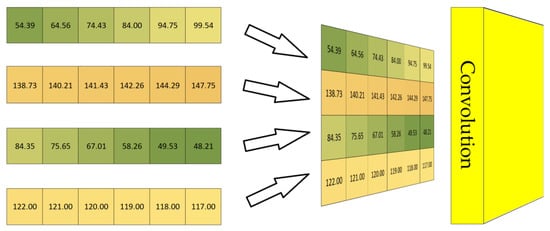 In the case of the CNN, two-dimensional data had to be prepared so that they could be input into the convolution layer. The second dimension consisted of delayed values of the time series. The current (relative to the analysed moment) and five historical values were introduced to obtain two-dimensional data with a total of six elements in the second dimension. Figure 7 shows an example of the transformation of six values of four variables (i) into a 6 × 4 grid. Due to the use of five delayed values of the original time series in the construction of new variables, variables (ii), (iv) and (vi) became redundant. Also, one of the variables (i), (iii) and (v) is redundant. Finally, those CNNs using a new two-dimensional input set based only on variables (i), (v), (vii) and (viii) were used in the research.