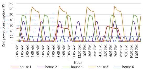 The study used real data from the Electricity Consumption and Occupancy (ECO) dataset collected from six houses in Switzerland over a period of approximately eight months at a frequency of 1 Hz. The dataset contains, among others, such data provided by smart meters as, the sum of real power over all phases, values of real power, current, and voltage over every phase separately. The plug meters collected the values of real power consumed by an appliance. Detailed information on the structure of energy demand in each property has been given among others in []. Since the original frequency was higher than assumed for the purposes of the study, it was necessary to reduce it. The frequently used time interval is 15 min (1/900 Hz−1) []. In this study, higher frequency data (with potentially higher practical usefulness) were used. As in [], the interval of 1/600 Hz−1, i.e., ten minutes, was applied. In order to carry out the transformation described above, arithmetic averages from one-second readings of power consumption for both the overall data and values representing power consumption by specific devices were calculated.