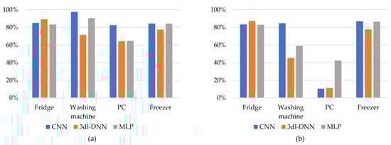 The analysis of the results achieved by the DNN models shows that the highest precision occurred when estimating the electricity consumption generated by the washing machine. Both the CNN and MLP obtained similar accuracy of estimation. High precision estimation was obtained by all models for fridge electricity consumption. The reasons for this are to be found mainly in the cyclicality of the appliance’s activity, as well as the availability of numerous patterns (at night, devices such as personal computers or washing machines are hardly ever active—similar observations were made by Parson et al. []). The worst results were achieved by modelling the energy consumption of the personal computer. It should be assumed that, in addition to the difficulty in creating time patterns of activity using ANNs, this is due to the fact that electricity demand is low in relation to total electricity consumption (Figure 10). Only the CNN was able to obtain acceptable values of accuracy. This could be attributed to the CNN’s ability to recognise complex patterns, as well as its use of input data from a longer time range (five delayed ten-minute intervals). It should be noted, however, that the low value of F1-Measure was caused by a large number of incorrectly classified cases of personal computer activity, which was recognised as inactive. The opposite estimation error characterised the results obtained by the MLP.