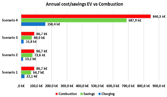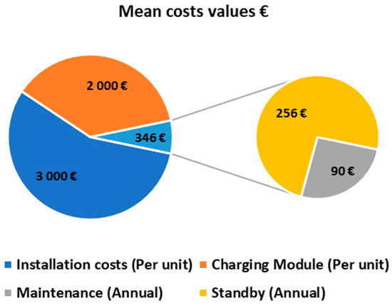 To determine the cost of electricity, the criterion was the medium voltage count, with average utilization and daily cycle, totaling a maximum annual cost of 25,661 €. Figure 1 summarizes the mean costs inherent to each charging station.