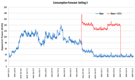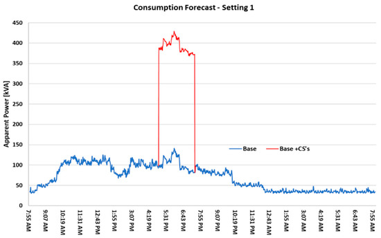 For sizing, the minimum power to be considered for each connection point shall not be less than 3680 VA [13]. Since the simultaneity factor is 1, the minimum power to be considered in a car park must be obtained by the sum of the powers assigned to each of the parking spaces considered for that purpose. The minimum number of seats (N) to be taken into account shall be obtained according to Equations (1) and (2) that were established by the Portuguese Directorate General of Energy and Geology (DGEG) in the Technical Guide to Electrical Installations for Electrical Vehicles Power Supply [13]: