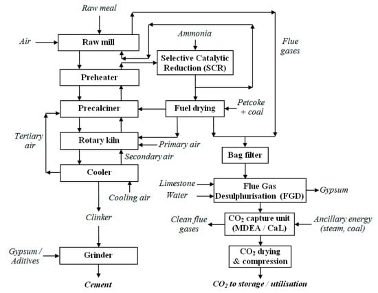 | Cement plant [4] | Plant capacity: 1 Mt/y cement 95% NOx removal yield by selective catalytic reduction unit 98–99% SOx removal yield by wet desulphurization unit Coal-based heat and power unit for ancillary energy consumptions |
