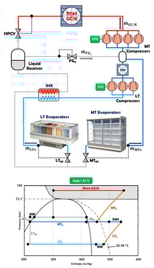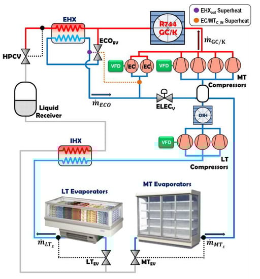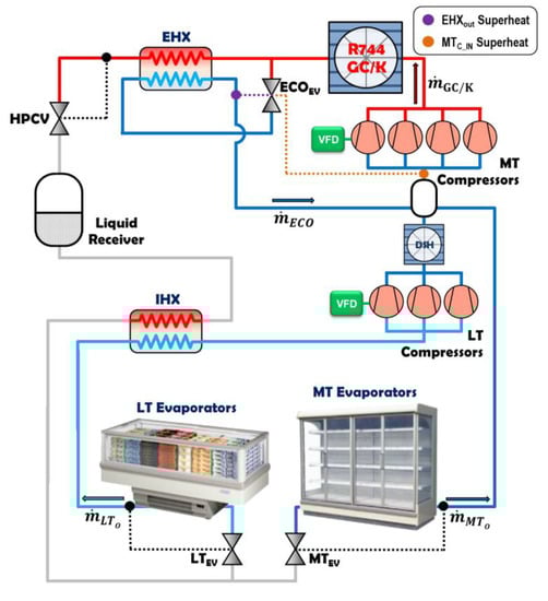 Finally, an IHX is installed at the outlet of the liquid receiver to ensure the liquid phase at the inlet of thermostatic valves (LTEV and MTEV) and to heat up the lubricant oil of the LT compressors [].