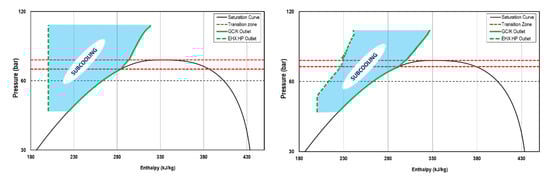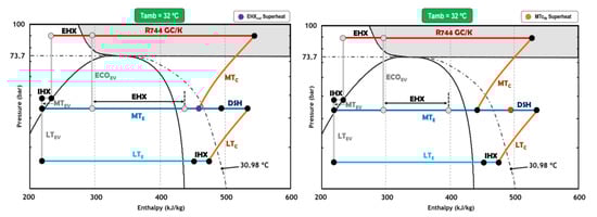 In this case, an additional heat exchanger named the economizer or subcooler (EHX) is introduced in the architecture (Figure 2). The EHX cools down the exhaust refrigerant from the GC/K by means of a stream of refrigerant extracted and expanded from the GC/K exit. The expanded fluid has low vapor quality; thus, the cooling capacity to reduce the temperature of the high-pressure stream is greater than that of other cooling systems that reduce the temperature with the vapor extracted from the liquid receiver. The expansion valve used in this case is labeled as ECOEV and its superheating control mode defines two different cycles, as can be shown in Figure 2. The first one (EHXOUT Superheat) controls the superheating degree at the exit of economizer, while the second one (MTC_IN Superheat) minimizes the superheating degree at the inlet of the MT compressors (MTC). Depending on the control mode adopted, the refrigerant mass flow injected and the degree of subcooling will vary, affecting the pressure of the liquid receiver.