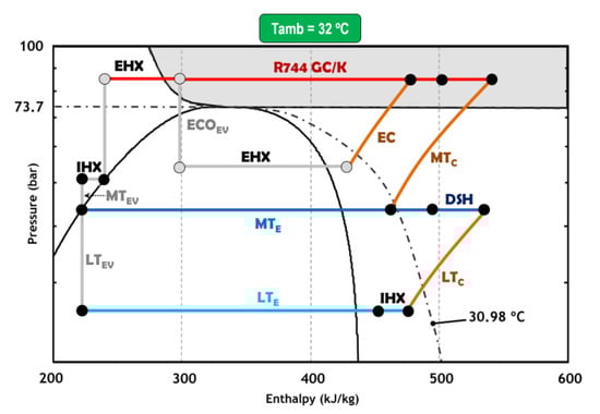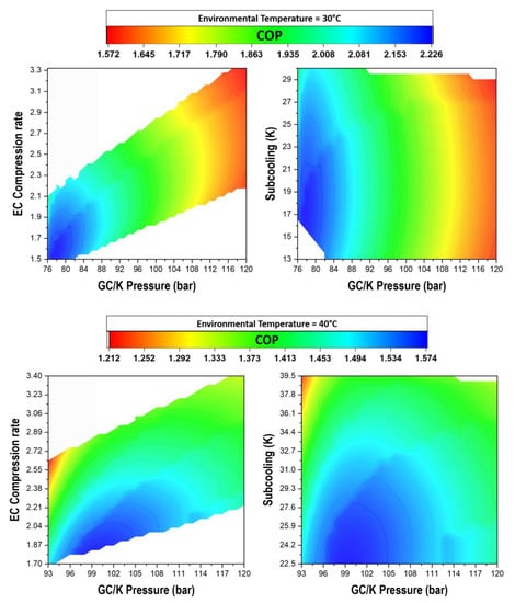 Since all the architectures described before use air as the secondary fluid, the heat rejection conditions depend on the ambient temperature. Hence, for transcritical conditions (PGC/K ≥ 73.75 bar), the temperature at the exit of the gas cooler has been obtained by means of Equation (1) with the ambient temperature (Tamb) and a temperature approach (ATD) of 2 K. The low value of ATD is based on the high thermal effectiveness of the gas cooler in transcritical conditions []. On the other hand, the heat rejection pressure was adjusted to the optimal one with an iterative method from 120 bar to 73.75 bar with small intervals of 0.05 bar.