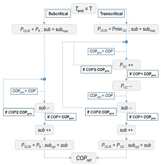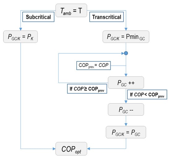 For the Basic Booster arrangement (BB) (Figure 4), the maximum COP is achieved at the optimum GC/K pressure (PGC/K) in transcritical conditions. In subcritical conditions, the optimal pressure corresponds to the condensing pressure (PK) except for the transition zone (near the critical point), where a linear pressure variation with the ambient conditions was considered according to Catalán-Gil et al. []. In transcritical operation, the iteration is started with the lowest transcritical pressure (PminGC = 74 bar), the COP is obtained with Equation (11), and the GC/K pressure is increased in steps of 0.1 bar (PGC ++). With this pressure, another COP is obtained and compared with the previous one (COPprev). If the current COP is higher, the GC/K pressure is further increased; else, if it is lower, the previous pressure is returned (PGC −−). This will be the optimum pressure that maximizes the COP (COPopt).