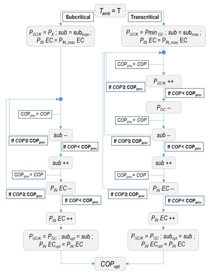 Hence, two iterative tested loops have been used in this arrangement. The first one determines the optimal heat GC/K pressure, while the second one is focused on determining the optimal subcooling degree which is achieved by varying the mass flow rate expanded by the ECOEV. The subcooling degree is changing in steps of 0.1 K (sub ++, sub −−).