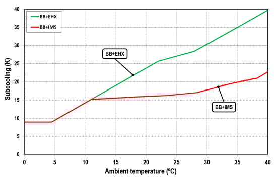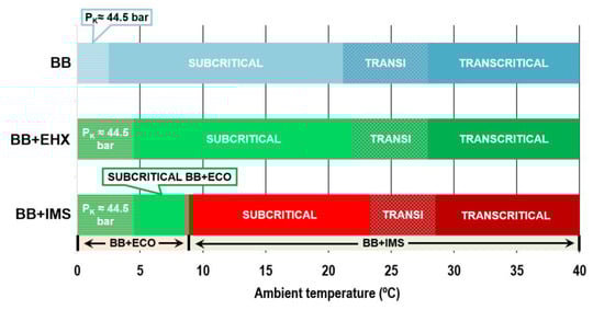 Finally, the inclusion of an additional compressor in the system (BB+IMS) modifies not only the subcritical limits but also the transcritical ones. Thus, this system works in transcritical operation for ambient temperatures above 28.5 °C and in subcriticial operation from 23.4 °C to 8.9 °C. Below 8.9 °C, the BB+EHX configuration is preferred because it works more efficiently.