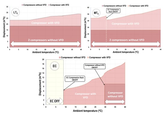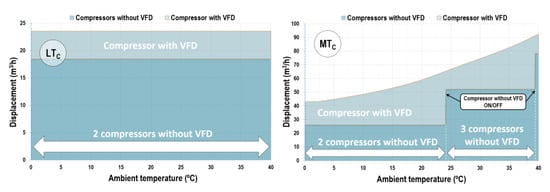 Regarding the medium temperature compressors (MTC), the volumetric requirements of the MTC are not constants. Thus, for ambient temperatures from 0 °C to 24.1 °C, the system operates with one MTC at nominal conditions (26.12 m3/h at 50 Hz) and one compressor with VFD operating from 16.95 to 39.18 m3/h (38.3–75 Hz). When the ambient temperature ranges between 24.1 °C and 39.4 °C, another compressor at its nominal conditions is switched on, and the compressor with VFD reduces its frequency to 25 Hz (13.06 m3/h). Finally, for ambient temperatures above 39.4 °C, a fourth compressor without VFD is switched on.