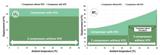 Figure 9 shows the displacement of the low and medium-temperature compressors of the BB+EHX system. This system cools the refrigerant after the GC/K, and the pressure of the receiver changes depending on the subcooling degree in the EHX. The optimal subcooling allows the receiver pressure to be close to the previous system (35 bar) for all ambient temperature. So, the graphs of Figure 9 are quite similar to Figure 8. The main difference is depicted in the temperature limits that are stated at 23.6 °C and 37.75 °C.