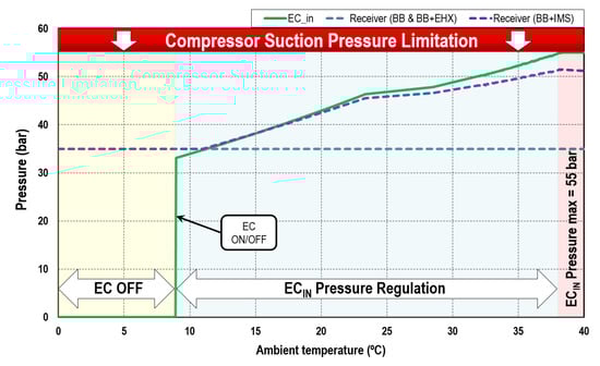 Optimal additional compressor (EC) suction pressure for BB+IMS and receiver pressure in all systems.