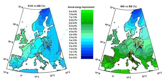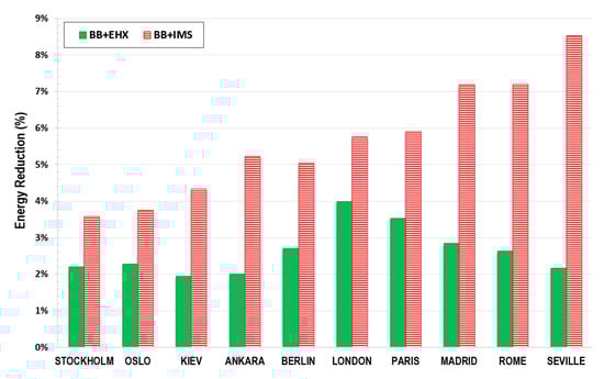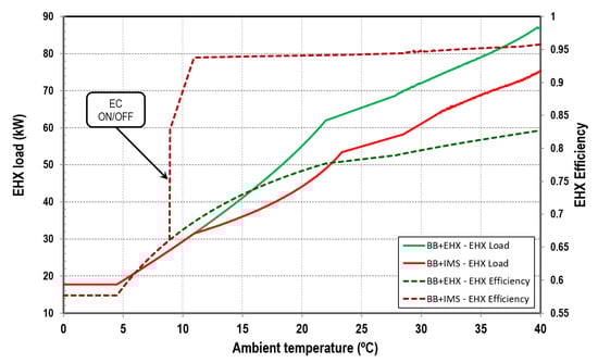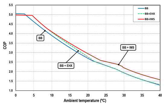 Similarly to Section 2.2, the configurations depicted in Figure 3 have similar results in terms of COP when the computational model developed in this manuscript is applied. Consequently, the analysis of the BB + IMS configuration will be referred to the configuration that controls the superheating degree at the exit of the economizer (EHXOUT Superheat), as its control is easier to implement.