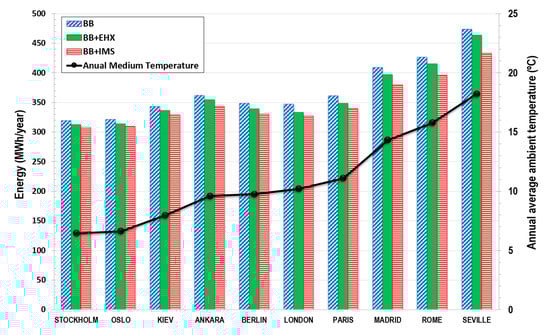 Taking into account the restrictions summarized in Section 3 and the best-performing conditions of the systems, Figure 7 presents the operation modes of each configuration according to the ambient temperature.