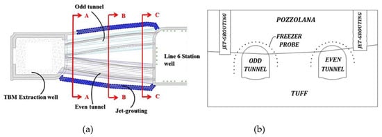 (a) Key plan of the tunnels and freezing probes, with indication of the three cross sections considered; (b) cross section of the case study with the position of the freezing probes.