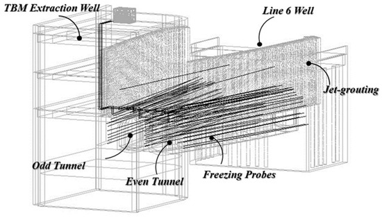 - Papakonstantinou, S.; Pimentel, E.; Anagnostou, G. Analysis of artificial ground freezing in the Pari-Duomo platform tunnel of the Naples metro. Numer. Methods Geotech. Eng. 2000, 281–284. [Google Scholar] [CrossRef]