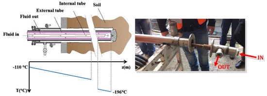 Phase 1-Nitrogen: The probes are fed with nitrogen at an inlet temperature of about −196 °C, while the expected outlet temperature is around −110 °C. The duration of Phase 1 is related to the time required for the formation of the minimum thickness of the frozen wall (1.5 m);