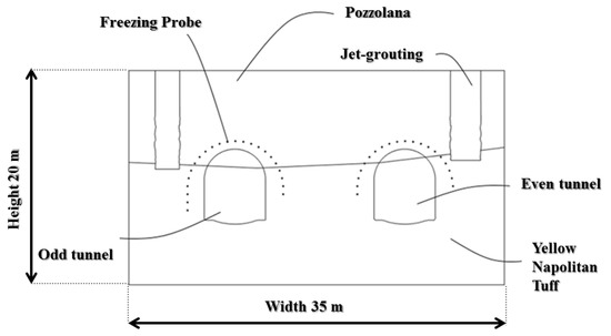 Several numerical and experimental works analyzing the AGF technique are available in the literature. Colombo [5] in the first part of his work invokes a well-known approximate approach for the a priori evaluation of the parameters influencing the technique, such as the time required to reach the target temperatures, or the heat flow rate needed by the plant. The results proposed by the author, applied to Neapolitan tuff, were compared with those obtained from a series of numerical analyses conducted by using the finite element method as a discretization technique, and with experimental data measured on site during freezing operations carried out for the realization of the galleries for the stations of Piazza Dante and Piazza Garibaldi of metro Line 1 in Napoli (Italy). Papakonstantinou et al. [6] first analyzed the experimental data of monitored temperatures in the ground during the freezing process, and then performed a numerical analysis through the FREEZE calculation code, a thermohydraulic software developed at the ETH in Zurich. The authors found that the thermal conductivity of the soil is an important parameter to be taken into account, and can be reasonably estimated by a posterior numerical analysis, if it not known a priori. Subsequently, Pimental et al. [7] analyzed the results of three applications of the AGF technique in urban underground construction projects, comparing the experimental data with the thermohydraulic coupled code model FREEZE. The first case study concerned the construction of a tunnel for the underground in Fürth (Germany) in soft ground with significant infiltration flow. The second case study concerned a platform tunnel in a metro station in Naples, and aimed at the determination of relevant thermal parameters through retrospective analysis, and to compare the results obtained by using the forecasting model with on-site measures. In the third case, regarding a tunnel under the river Limmat in Zurich, numerical simulations were used to identify potential problems caused by geometrical irregularities in the well layout, in combination with infiltration flow. Russo et al. [1] analyzed the experimental data collected during the execution of the excavation with the AGF technique, and developed a numerical model to evaluate stress in the ground during the freezing and defrosting of a frozen wall. The focus of the work was the settlement caused by the tunnel excavation, and the use of the AGF technique to allow the safe digging of a service gallery located half in the silty sand layer, and a half in the yellow tuff layer, below groundwater. The phases of the tunnel construction were accompanied by the monitoring of the measurements and control activities of the effects of the gallery excavation. The measurements collected during the construction process, in fact, allowed us to monitor the freezing-thawing process, and the change in volume related to the excavation, providing useful information for the future implementation of similar projects. Finally, the analysis in the test procedure was conducted using a complete three-dimensional (3D) model implemented in the DFM Flac3D package.