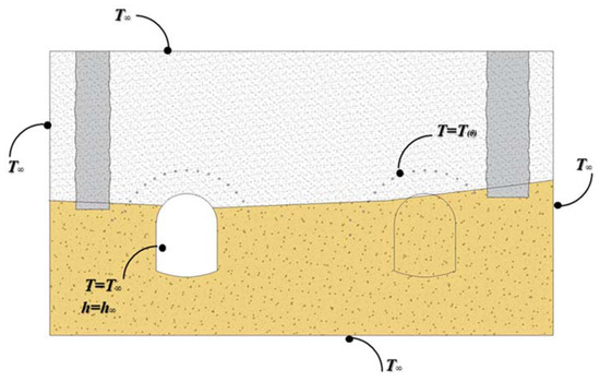 The boundary conditions employed in the present model refer to the soil and probes domain and are sketched in Figure 7 and Figure 8. In particular, Figure 7 refers to the domain considered before excavation of the first tunnel, while Figure 8 refers to the domain considered after excavation of the first tunnel. The temperature of the top, bottom and lateral surfaces of the soil has been assumed to be constant during the analysis, equal to the average yearly temperature of the site under investigation, 16 °C.