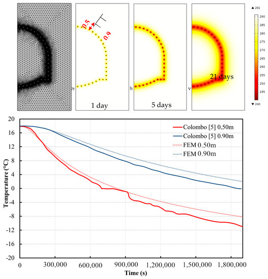 The present model has been validated against the numerical data reported by Colombo [5], which is validated with on-field data. In that study, the software ABAQUS was used to solve the numerical model, and the computational domain was meshed by using DC2D4 elements. The geometry of the tunnel was symmetric. The present study reproduces the case study of Colombo [5], based on a 2D model, by taking into account a computational domain representative of a portion of land equal to 10 × 20 m. A mesh consisting of 33,605 triangular elements has been considered, and the thermal characteristics of the materials are those reported in Colombo [5], in particular: volumetric heat capacity of 1910 kJ/m3K and 3100 kJ/m3K for solid and liquid phases, respectively; thermal conductivity of 3.07 W/mK and 1.48 W/mK for the solid and liquid phases, respectively; volumetric latent heat of 179,280 kJ/m3 and a saturated tuff density of 1550 kg/m3. The initial temperature has been assumed equal to 18 °C, and the analysis has been carried out, imposing a linear variation of temperature down to −33 °C for the first day, on the nodes representing the perimeter of the freezing probe. In order to compare the results obtained from the present FEM analysis with those reported in Colombo [5], the authors have considered two points located on a line orthogonal to the junction between the probes, at 0.50 m and 0.90 m. Figure 10 shows the conditions that determine the propagation velocity of the freezing front in the tuff, evaluated for two points located at 0.5 m and 0.9 m from the freezing probe. It is evident that the temperature gradually decreases over time, and that a good agreement between the present numerical results and those available in the literature [5] is observed.