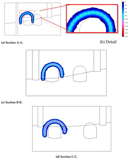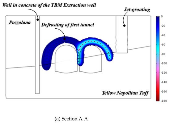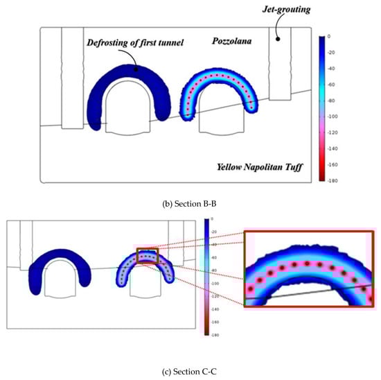 Figure 11 reports the temperature field calculated after 14 days of nitrogen feeding in the three sections considered for the odd tunnel (refer to Figure 3), and it is possible to clearly see the formation of the frozen wall, since the figure reports only the temperature values below −2 °C.