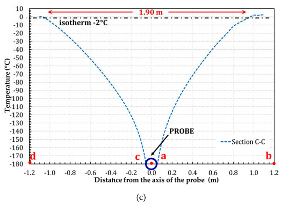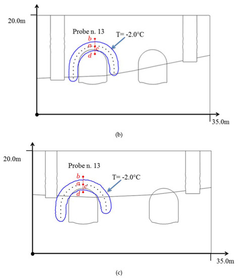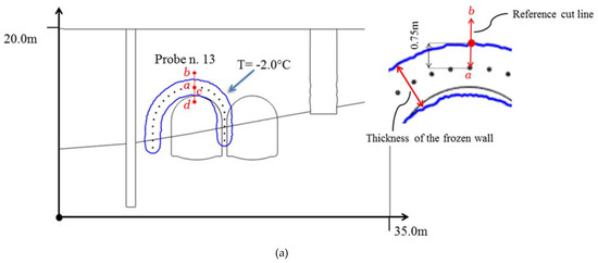 Figure 12a shows the frozen wall thickness reached after 14 days of nitrogen freezing phase, by showing the isotherms at −2 °C, and reports a detail of the frozen wall for section A-A. Figure 13b and Figure 12c show the frozen wall thickness reached after 14 days of nitrogen freezing phase, by showing the isotherms at −2 °C, for sections B-B and C-C. Moreover, the figure presents a vertical segment across probe n. 13, that is considered useful for the analysis of the temperature field in the frozen wall.