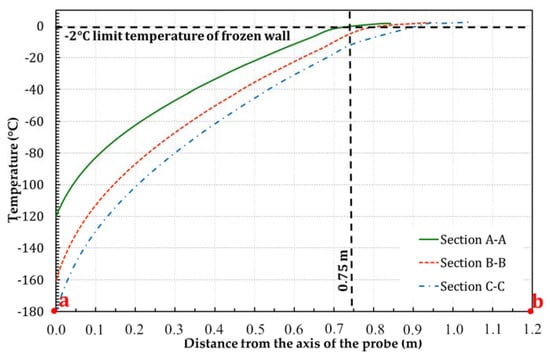 Figure 16a presents the temperature profiles at the sections A-A, B-B, and C-C. From the analysis of this figure, it is possible to notice that the section located 5 m from the TBM well (A-A) is the most disadvantaged for the freezing process. This is due to the nitrogen freezing temperature imposed on the probe perimeter in this section (−120 °C), which is higher than that in the other sections. Consequently, more time is needed for the formation of the frozen wall in this section, defining the total duration of the freezing Phase 1 (nitrogen activation). After almost 5 days of activation with brine, constant temperature values can be reached, but always below the safety value of −5 °C.