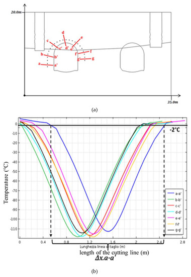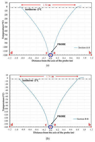 Figure 13 shows the temperature profile calculated on a vertical segment of 1.5 m from probe 13 (point a) to point b for the three sections considered, as shown in the previous figure. From the analysis of the figure, it is evident that at the end of the first phase, the frozen wall has reached the minimum required thickness of 1.5 m.