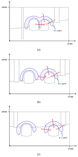 Thickness of the frozen wall represented through isotherm at −2 °C, for section A-A (a), section B-B (b); section C-C (c).