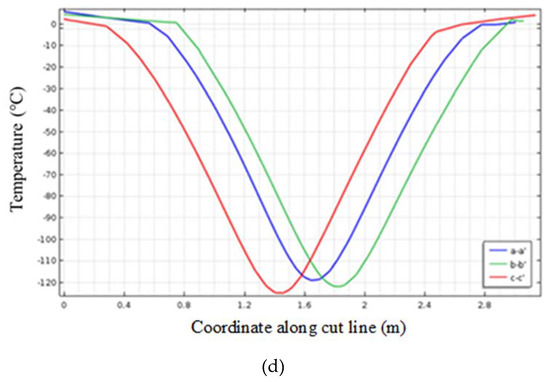 Figure 18d shows the temperature profile at three cut lines of section C-C during the freezing process of the even tunnel. From the analysis of this figure, it is possible to observe that the temperature values below −2 °C involve a thickness of ground around 2.1 m, in all the three cut lines considered, as reported in Table 4. This is a relevant result, proving that the minimum ice wall limit (1.5 m) is respected in the whole ice vault.
