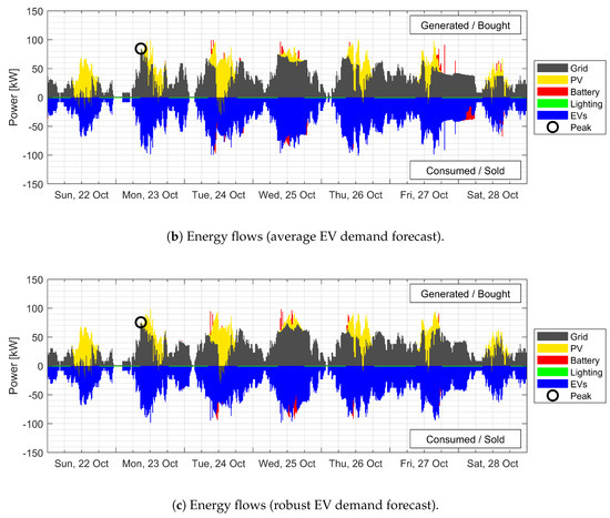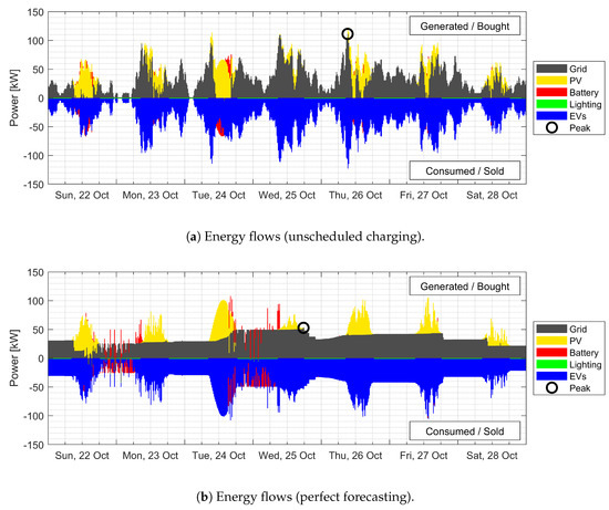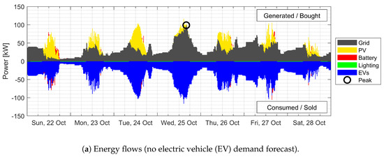 Figure 4, similarly, shows the energy flows in the system for the three scenarios. As seen in Figure 4a, where no EV forecast is available, the magnitude of the highest peak in this case (100 kW) is lower than that in the unscheduled case. Relative to the perfectly forecasted case, though, the peaks are considerably higher. A drawback of the scenario can be seen in the situation leading to the Wednesday afternoon peak. The EVs in the parking lot on Tuesday night was charged slowly to reduce the peak load at night. This led to a larger number of vehicles in need of simultaneous charging on Wednesday morning, leading to a high peak in electricity demand in the afternoon. On the other hand, the Thursday peak seen in the unscheduled charging case was effectively shifted.