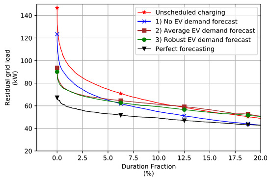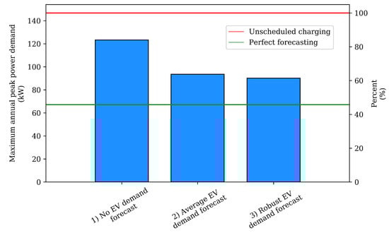 Without EV demand forecasting, the maximum annual peak load of the solar carport was reduced by 16% in our case relative to unscheduled charging. This was, however, considerably less effective than in the reference case with perfect forecasting, where the magnitude of the annual peak was reduced by 54%. The inclusion of a single 24 h horizon EV forecast reduced the peak in the solar parking lot by 36%, increasing the effectiveness of the scheduled charging by an additional 20%. Consideration of multiple forecasts of possible EV demand and robust adjustment of the schedule for the performance of the worst possible forecast marginally improved the effectiveness of the scheduling, reducing the peak by 39%.
