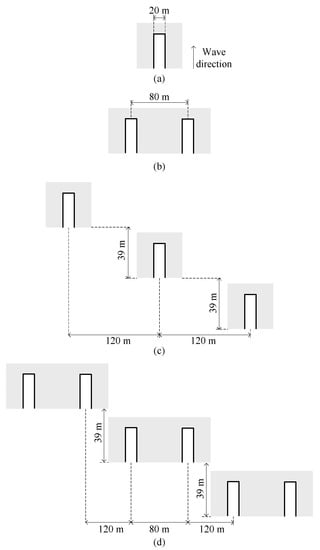 An array of VOWCs can be designed effectively to smooth the electrical power output taking advantage of the temporal–spatial distribution of the wave energy. For an array layout, researchers have proposed different patterns such as rectangular, semicircular, triangular, etc. Nonetheless, the pattern is given less importance compared to the distribution of surge separation distance [,,,,]. Therefore, three isolated VOWCs and three VOWCDBCs placed in a hypotenuse of a right triangle as shown in Figure 1c,d were selected to improve the power smoothing. The configuration of five times the width of the VOWC for the spacing between two VOWCs was also considered as recommended in [].