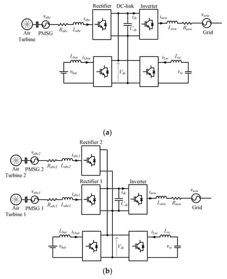 This study is vital, since the array of VOWC technology is adaptable for existing ocean structures or future developments such as breakwaters. Placing multiple VOWCs in a breakwater may affect the pressure profiles of each VOWC and thus significantly change the energy capture. Therefore, the array layout should be designed in a way to gain the benefit of these interactions. Moreover, spacing between the VOWC devices should be tuned to the local peak wavelength as explained in [,]. Since the research in OWC array configuration is still at an early stage, information regarding optimal OWC array configurations or the efficiency reductions/fluctuations of OWC array devices is limited. Therefore, this model does not include hydrodynamic interactions of VOWCs. Instead, it concentrates on (1) a single PMS for grid integration of an isolated VOWC, (2) a nearshore detached breakwater (VOWCDBW), and (3) two different array configurations of VOWCs with a shared hybrid energy storage system as shown in Figure 1.