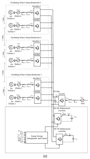 Schematic diagram of the electrical power conversion system. (a) single VOWC wage energy converter (WEC), (b) single VOWCDBW with two VOWC WECs, (c) hybrid array of VOWCs in the VOWCDBW.