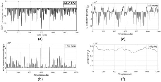 In the first case study, an isolated VOWC was designed as in []. The pressure head of the VOWC chamber is shown in Figure 3a. Figure 3b shows the air-turbine mechanical torque. The turbine-generator rotor angular speed is illustrated by Figure 3c. This was maintained between 20 and 157 rad/s throughout the simulation as predesigned. This variable rotational speed control approach enables the turbine to respond efficiently to a wider range of sea states and widen the response of the turbine to varying power levels of the waves []. Operating the air-turbine speed at variable speed also helps to reduce the supercapacitor size []. Figure 3d, illustrates the turbine-generator power output, grid power supply, and the supercapacitor power. The Li-ion battery power is shown in Figure 3e. The supply power to the grid is maintained closer to the reference with the 19.8 F supercapacitor. The power output is gradually varied between 380 to 453 kW, from start to the end, for 1200 s. This power fluctuation is considered acceptable by the Australian Energy Market []. The enlarged grid power output and the rate of change of the Li-ion battery SOC% are shown in Figure 3f,g, respectively. The output power reference is adjusted by the PMS throughout the simulation, maintaining the battery SOC% in desirable limits based on the deviation of the Li-ion battery SOC 65% and the rate of change of SOC. The DC-link voltage is regulated close to its reference within 9% deviation as shown in Figure 3h. Figure 3i, depicts the SOCs of the supercapacitor and Li-ion battery, which illustrate the energy transfer according to the PMS.