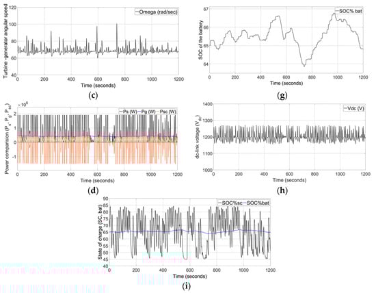 Figure 6a, shows the output power of the turbine-generator, supply power to the grid, and supercapacitor. The Li-ion battery power is illustrated in Figure 3b. Figure 6c,d depict the enlarged version of grid power and Li-ion battery SOC%. The supply power to the grid is maintained with a 39.6 F supercapacitor. The power output is gradually varied between 1250 to 1370 kW, from start to the end, 1200 s. The DC-link voltage is controlled close to its reference within 14% deviation as shown in Figure 6e. Figure 6f depicts the SOCs of the supercapacitor and Li-ion battery.