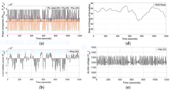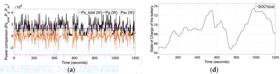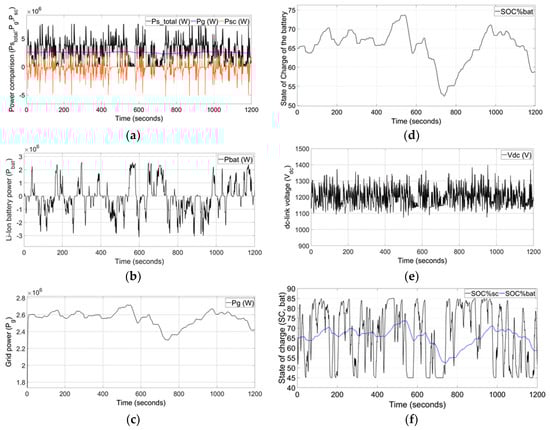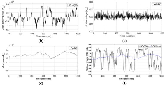 The simulation results of powers, turbine-generator output power, supply power to the grid, and supercapacitor power are illustrated in Figure 7a. Figure 7b depicts the Li-ion battery power. Figure 7c,d shows the enlarged version of grid power and Li-ion battery SOC%, respectively. The supply power to the grid is maintained with a 39.6 F supercapacitor. The power output is gradually varied between 2300 to 2717 kW, from start to the end, for 1200 s. The DC-link voltage is regulated close to its reference within 14% deviation as shown in Figure 7e. The SOCs of the supercapacitor and Li-ion battery are depicted in Figure 7f.