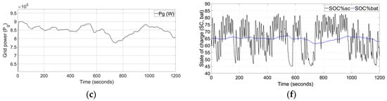 The simulation results of turbine-generator power output, grid power supply, and supercapacitor power are illustrated in Figure 4a. Figure 4b depicts the Li-ion battery power. Figure 4c,d shows the enlarged version of grid power and Li-ion battery SOC%, respectively. The power is supplied to the grid following the reference, 900 kW with 39.6 F supercapacitor compared to case study 1. The power output is gradually varied between 700 to 900 kW, from start to the end, 1200 s. The DC-link voltage is regulated close to its reference within a 14% deviation as shown in Figure 4e. Figure 4f shows the SOCs of the supercapacitor and Li-ion battery.