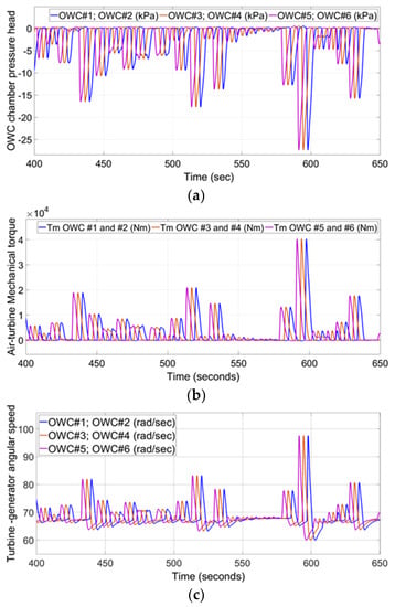 The pressure heads of the VOWC chamber #1, #3, and #5 are shown in Figure 5a. The same pressure head that occurs in #1 occurs in #3 after 3.25 s and in #5 after 6.5 s. due to the configuration of the array. Figure 5b depicts the VOWC #1, #3, and #5 air-turbine torques. Figure 5c depicts the VOWC #1, #3, and #5 turbine-generator rotor angular speeds. The controllers have maintained the angular speeds of all the air turbines within the set range.