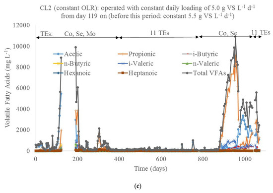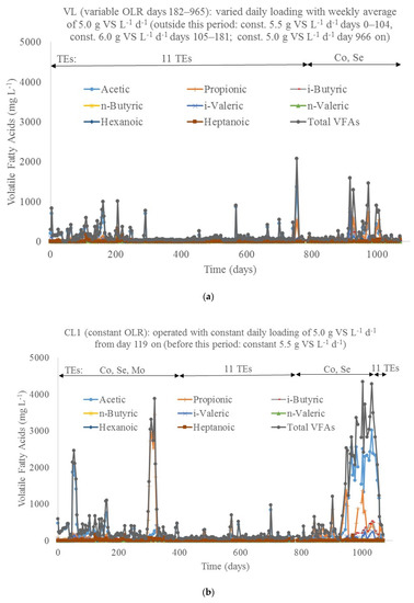Most notably, from day 777 on, when supplementation with the 11 TEs was stopped and only Selenium and a reduced dosage of Cobalt were added, digester VL showed less VFA accumulation compared to digesters CL1&2. A delay in reaction to this change in operation is visible for all digesters, reflecting the time required for washing-out of the earlier dosages of the 11 TEs. After day 970, some elevated acid concentrations were detected in digester VL, but this was a short-term phenomenon only and observed concentrations were moderate (less than 1600 mg L−1). In contrast, VFAs started to accumulate in both CL1&2 seven weeks after dosage with the 11 TEs had been stopped. From day 950 on, the concentration of total VFAs fluctuated at around 3000–4000 mg L−1 in CL1 and 8000–10000 mg L−1 in CL2. Acetic acid remained the dominant component in CL1. However, propionic, iso-butyric and iso-valeric acid, reported to be most influential to inhibit mono-digestion of food waste under trace element limitation [9,23], also occurred in high concentrations with propionic acid, even becoming the dominant species in CL2. It can be assumed that this accumulation of acids was induced by trace element limitations. This assumption is confirmed by the observation that, when supplementation with 11 TEs to digesters CL1&2 began again from day 1056 on, total VFA decreased very rapidly to below 500 mg L−1 (Figure 2).