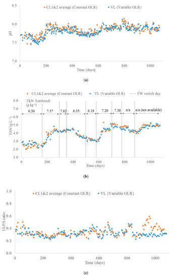 Operational parameters of digester VL with variable OLR and the control with constant loading (CL1&2, average values): (a) pH of digester content (measured in digestate leaving the digester); (b) Ammonia of digester content (additionally, TKN of feedstock is provided); (c) Alkalinity of digester content.