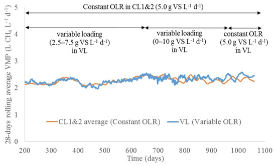 Biogas methane concentrations were stable at around 58% ± 2% throughout the experimental period for all digesters. The comparison between digesters with constant and variable loading started from day 182; at this time, digester VL had shown stable operation at constant loadings (5.5 g VS L−1 d−1, then 6.0 g VS L−1 d−1) for almost 200 days (26 weeks). When looking at the methane production during the comparison period (from day 182 until day 1068) (Figure 4), no obvious difference was found between VL and CL1&2 when all digesters were supplemented with the full spectrum of 11 TEs (days 392–776); in all cases, the volumetric methane production (VMP) fluctuated around an average of 2.27 L CH4 L−1 d−1. It is noteworthy that when larger loading variations (0–10 g VS L−1 d−1) were introduced in digester VL from day 632, the 28-day rolling average VMP showed stronger fluctuations. Nevertheless, in tendency the average methane production remained unchanged. When looking at the gas production from periods with different variable OLR, methane production was smoother at loading rates of 2.5–7.5 g VS L−1 d−1.