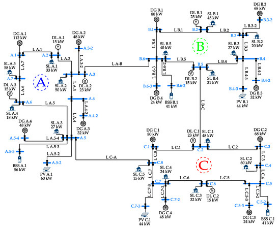 The total installed capacity of DGs, PV, and BSS in each hybrid microgrid is listed in Table 2. The nominal active power of the clustered microgrid lies around 950 kW, whereas the total load demand is about 650 kW. In the classical scenario with DGs only, the installed capacity of the DGs remains unchanged—i.e., equal to 665 kW, which is slightly higher than that of loads. The ratio of the total nominal active power of DGs, PV, and BSS lies around 70:15:15, independent of the operating mode.