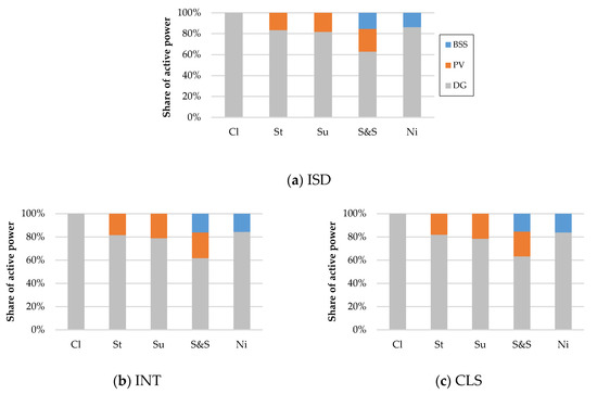 Depending on the time of day (scenario) and degree of coupling (operating mode), reserve DGs were activated or deactivated, such that the engine loading lies between 70% and 80%—see Section 2.1. According to Table 3, the minimum number of active DGs is equal to 2 (“sun & storage” in the island mode), while the maximum number of operating DGs is 12 (“classical” and “storage” in the cluster mode). In this research work, only microgrid C is studied in the islanded (ISD) mode, whereas the coupling of microgrid A and C is investigated in the interconnected (INT) mode. Microgrid A, B, and C are connected with each other in the form of a ring in the clustered (CLS) mode.