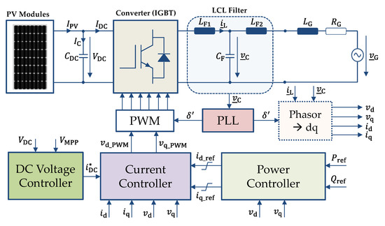 Block diagram of grid-feeding photovoltaics with corresponding controllers, according to [35,36].