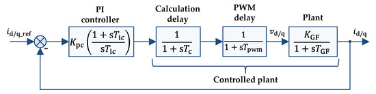 The block diagram of the current control loop comprises a PI controller and a controlled plant, which is made up of three first-order delay blocks [35]—cf. Figure 4. In order to reduce the complexity in representing the transfer function of the plant, an L filter was taken into consideration [35]. In principle, modulus optimum can be employed to dimension the parameters of the PI controller ( and ), since there is no integrator block in the controlled plant [37].