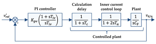 Figure 5 illustrates the block diagram of the outer control loop, which comprises a PI controller and a controlled plant. The latter consists of a calculation delay, inner (current) control loop, gain, and plant. The plant is an integrator block due to the DC-link capacitance. Hence, symmetrical optimum was employed for dimensioning the parameters of the PI controller and [37,38].