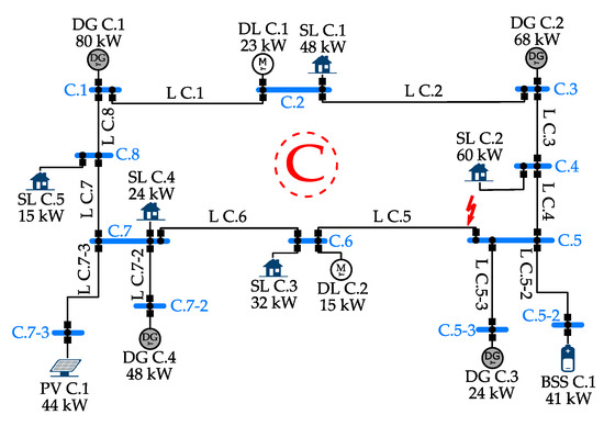 The three-phase fault location in microgrid C in scenario “storage” (representing all the installed grid equipment) is shown in Figure 9. Since the short-circuit location is very close to a DG and a grid-forming BSS, the fault is assumed to be critical. The fault clearance is achieved by tripping the affected line only, i.e., L C.5, with the help of differential protection. The clearing time is identical in each scenario and corresponds to the minimum value of the CCT among the scenarios. It should be noted that, in this research work the resistance of the fault was assumed to be 0.02 Ω.