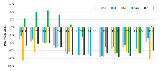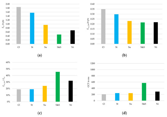 The three-phase fault on both ends of L C.5, i.e., very close to BB C.5 and BB C.6, was studied to determine a correlation between the CCT and the critical energy of the system and of the critical machine. The critical generator in each scenario in the clustered operating mode is DG C.2, whereas DG C.1 represents the critical machine in scenario “sun & storage”. It should be noted that the scenarios will not be compared with each other in this section. However, the CCT, , and will be analysed in each scenario—cf. Figure 38.