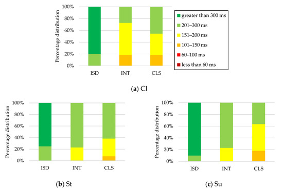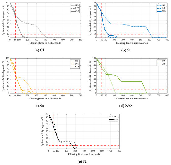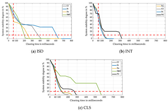 Firstly, the CCT of microgrids with respect to the 15 cases were calculated by performing RMS-simulations (fault on lines) with a fault resistance of 0.02 Ω. This allows to compare the CCT values with respect to the scenarios and operating modes, so that the sensitivity of the microgrids can be assessed in terms of transient stability. The methodology of the calculation of the CCT has been given in [20]. The CCT values were categorized according to Table 9. The minimum feasible clearing time (differential protection) in the studied microgrids is approximately 60 ms [47,48,49,50].